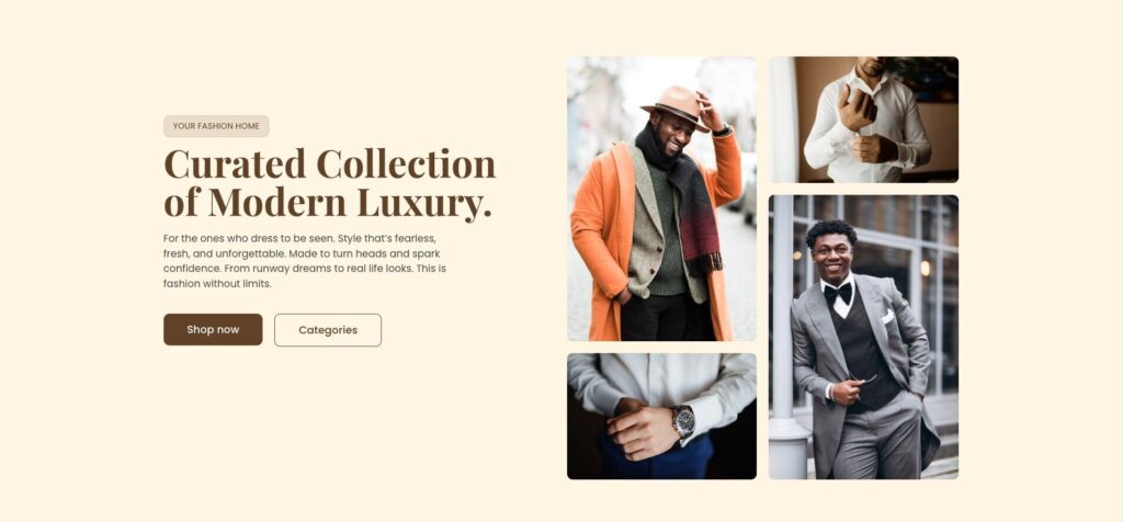 E-Commerce Fashion Platform for Luxury Men’s Wear. Showcases curated clothing, accessories, and lifestyle collections for style conscious shoppers.